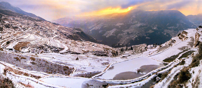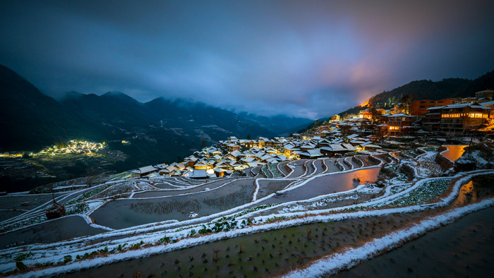 加榜梯田的雪景,是大地写给冬日的诗。层层叠叠的田埂被白雪勾勒,化作“大地的指纹”,黑白交织顺着山势蜿蜒起伏,炊烟从苗寨升起,雪雾在田垄间流转,水墨丹青般的意境,把田园静谧美到了极致。