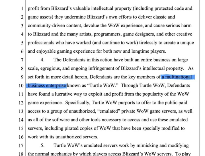 2025 年 8 月 29 日,暴雪正式对 Turtle WoW 提起诉讼。这不是停止函,而是一场严厉的法律诉讼,核心指控包括: