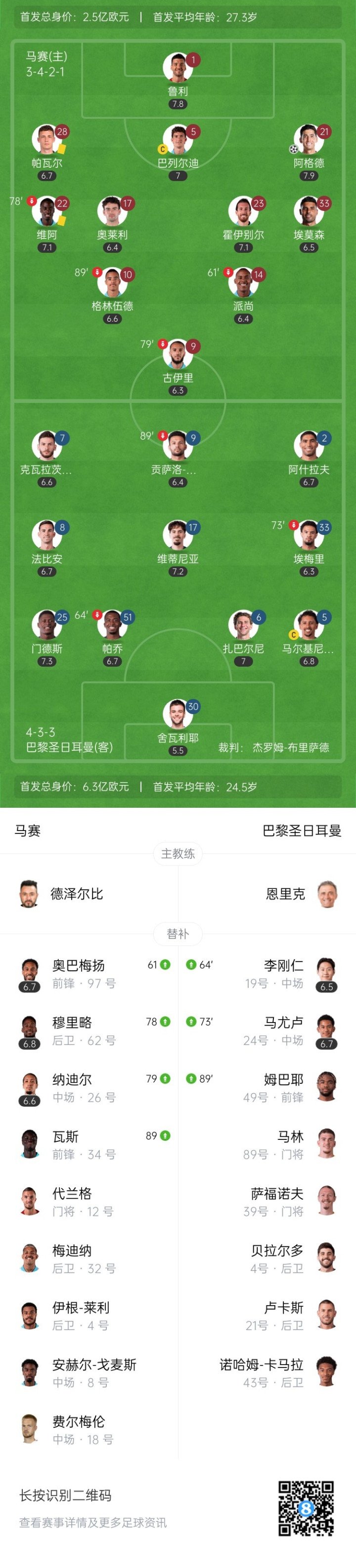 下半场补时5分钟。最终全场比赛结束,马赛1-0巴黎。