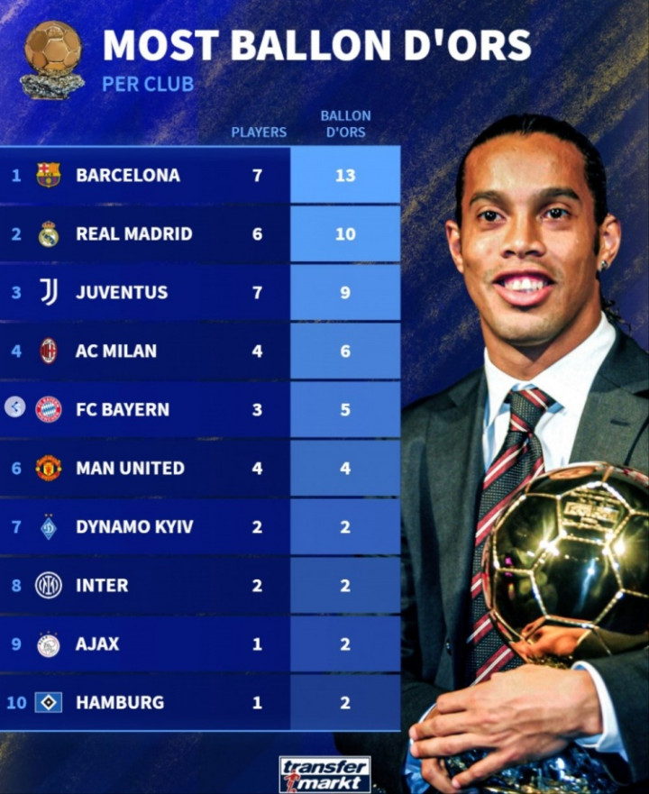 俱乐部球员夺金球次数排名: 巴萨7人13次居首, 皇马6人10次第2