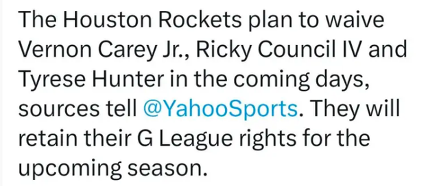 除了尼克斯和麦康耐尔,休斯顿记者凯利-艾科还透露火箭签下小弗农-凯里、康西尔四世以及泰瑞斯-亨特,之后他们会被裁掉,下一站发展联盟。