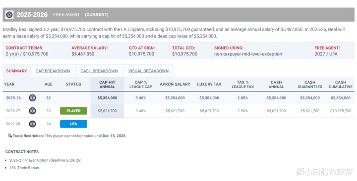 随后比尔以两年1100万的合同签约快船,这份合同实际上是两年1097万,25-26赛季为535万,26-27赛季562万(球员选项),这份合同还包含15%的交易保证金。
