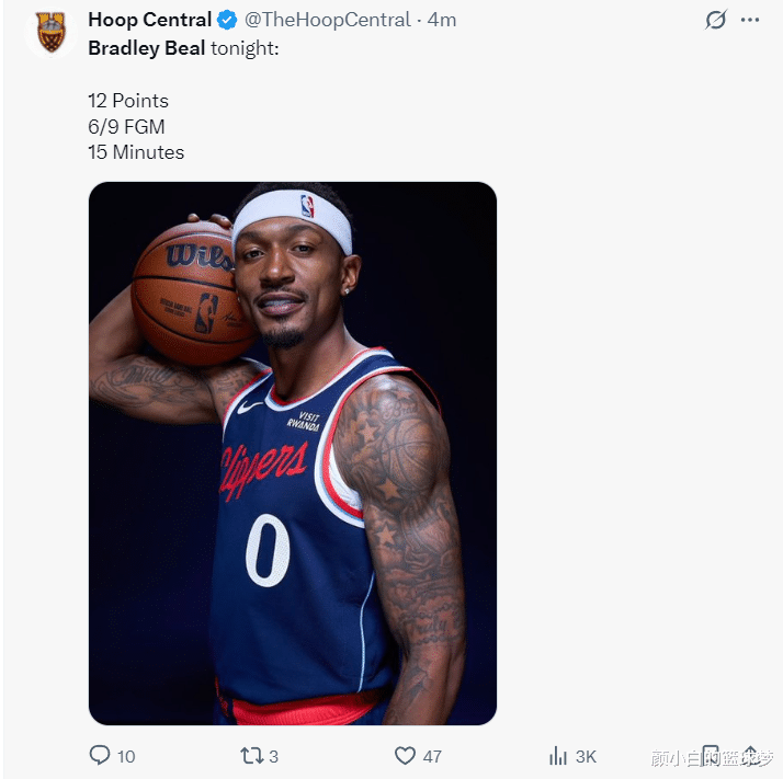 北京时间10月18日,NBA季前赛,快船VS勇士。这场比赛布拉德利-比尔迎来了自己快船生涯的首秀,他此前的三场比赛都是每日观察轮休,32岁的比尔是快船今夏重要的补强之一,此役他短短14分钟就拿到12分,展现了不俗的竞技状态。